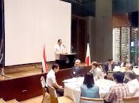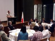 そして、田村 裕先生からは、現在進めている東南アジアを中心とした大学の国際戦略について述べられ、これまでのご支援への御礼とともに、今後のさらなる大学との緊密な連携と協力体制の強化を要請された。続いて、校友会本部からの記念品が寺内会長より中村会長へ贈呈され、燈田進評議員会副議長の乾杯の発声で歓談となった。各テーブルでの交流に華が咲き、途中には、母校の近況を納めたDVDなどを観覧しながら、母校のこと、仕事のこと、各世代それぞれの時代を懐古しつつ、親睦を深めた。宴もたけなわとなり、全員で記念撮影をし、馬渕純一事業副部長のリードにより全員で方を組んで逍遙歌を合唱、最後は、泰国千里会の角田 勇副会長から、国際化へと取り組む母校に対して今後も協力を惜しまないとの力強いお言葉をいただき閉宴となった。