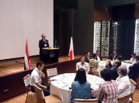 古渕孝仁事業副部長の司会により進行。中井邦夫事業部長の開会の辞、続いて、全員で学歌を斉唱し、来賓の田村 裕国際部副部長、そして泰国千里会からの参加者をそれぞれ紹介した。寺内俊太郎校友会長から母校への協力への感謝の言葉が述べられ、泰国千里会の中村良三会長からは10数年にわたる泰国千里会の紹介と歓迎の言葉が述べられた。