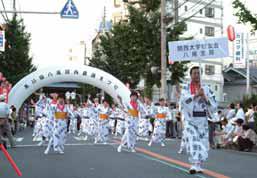 ケーブルテレビの生中継では、松井幸一幹事(昭41経)が「関大浴衣」姿で昨年に引き続き、河内音頭解説者として生出演をし、解説途中で八尾支部の踊りの輪の中に合流。関西大学校友会八尾支部の存在を大いに発揮した。