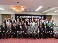 第2部では、来賓に寺内校友会長、東淀川区の金谷区長(54年卒)、市内各支部からの来賓13人を含め総勢38人の出席で懇親会が開催された。記念写真の撮影、田中支部長の開会挨拶、寺内校友会長に来賓挨拶をいただいた後に、田中義信大阪市内支部連合会会長の発声で乾杯し、開宴。