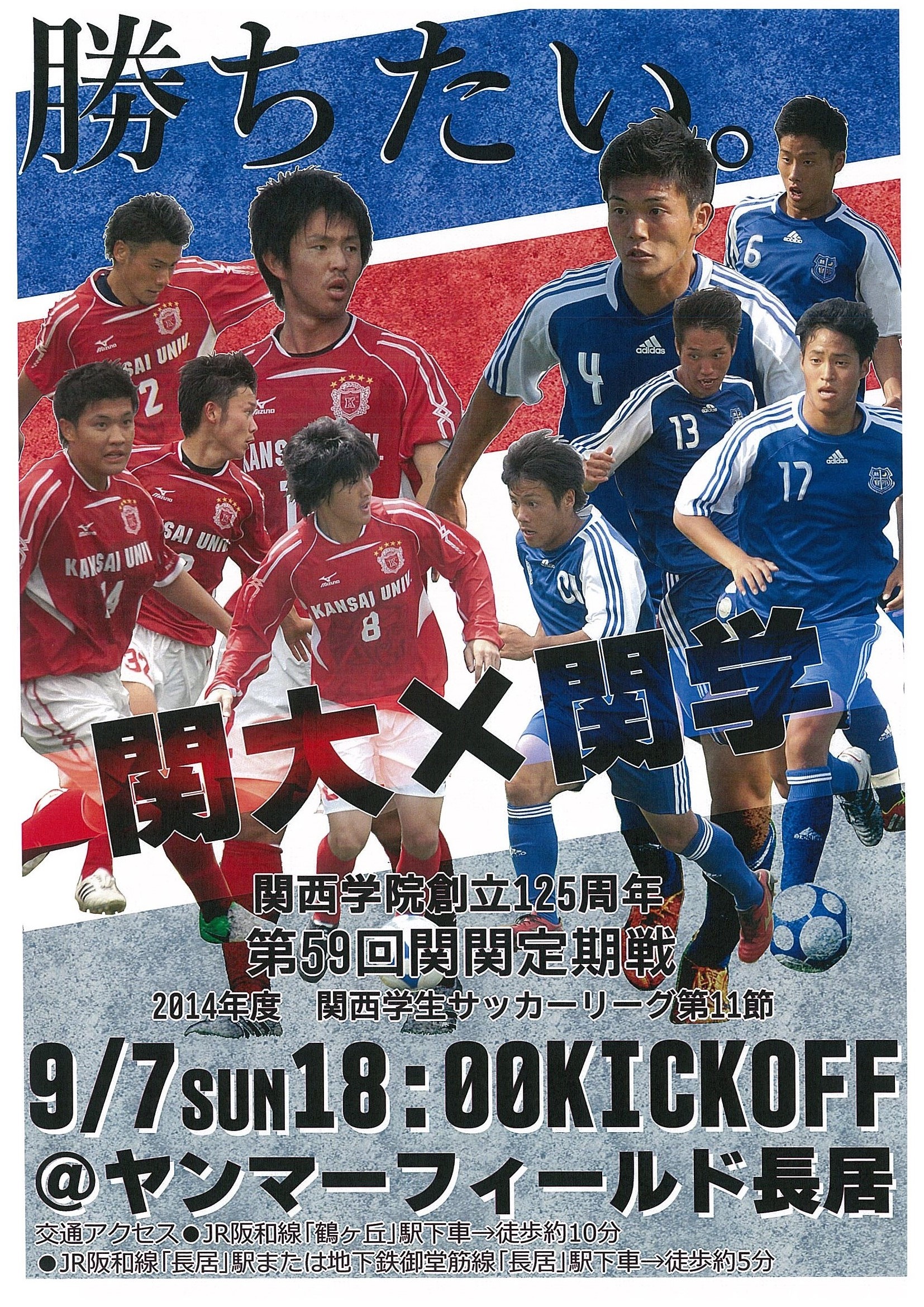 第59回関関サッカー定期戦 兼 2014年度関西学生サッカーリーグ第11節 関西大学vs関西学院大学 開催のお知らせ 2014年09月04日 9月7日(日)に体育会サッカー部の関関戦(第59回関関サッカー定期戦 兼 2014年度関西学生サッカーリーグ第11節 関西大学vs関西学院大学)がヤンマーフィールド長居にて開催されます。 両校のプライドをかけた伝統の一戦で、関西大学が勝利を成し遂げられるよう校友の皆様の応援を是非ともよろしくお願いします。 ●日 時:9月7日(日)18時00分 キックオフ ●場 所:ヤンマーフィールド長居(地下鉄御堂筋線・長居駅下車徒歩5分) ●対戦相手:関西学院大学 ●入場料:1000円(中高生400円)