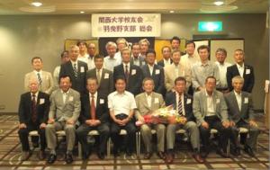 総会では、学歌斉唱、金銅支部長の挨拶、本部の渡邊泰之副会長から祝辞と大学の近況報告をいただいた。特に、女子学生の比率の多さに会場から驚きの声が上がった。また、顧問の北川嗣雄羽曳野市長、谷畑孝衆議院議員からも祝辞をいただいた。