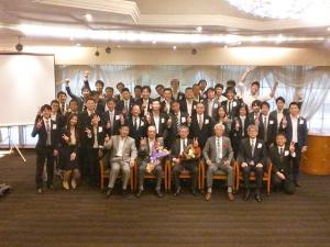 宴の最後に、この春までに定年を迎えられた金子政晃さん(54建)、佐藤忠司さん(49土)のお祝いに、後輩を代表して東野春奈さん(平26商)、岩田彩さん(平21社)から花束を贈呈、参加者全員で祝った。