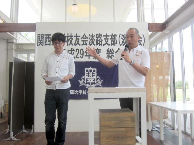 総会の後は、懇親会。今回は初めて現役の関大生が参加。工学部4回生の太田雅巳さん(洲本市出身)から「この夏に1週間限定の海の家をオープンします。建築家が語る!まちづくりセミナー・竹の小物づくり・流しそうめん等やりたいことをやろうという企画です。ご協力をよろしくお願いします」とのアピールがあり、出席者はサポートすることを拍手で確認した。