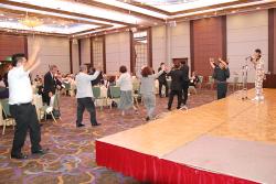 青年部藤本康志・真希夫妻の司会で第3部懇親会が開宴。北田常務理事、後藤吹田市長の祝辞のあと、昨年の支部総会で知り合い、今年4月に結婚した野田哲・裕岐夫妻に谷支部長からお祝いを贈呈、参加者も盛大な拍手で祝意を表した。