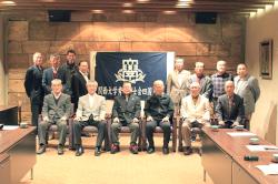 総会に先立ち、支部旗を囲んで記念撮影、開催県(愛媛)を代表して平野栄副支部長(45文)の歓迎の挨拶があり、総会は三宅支部長の開会挨拶、市場寮士会々長の来賓挨拶のあと、議事に入った。