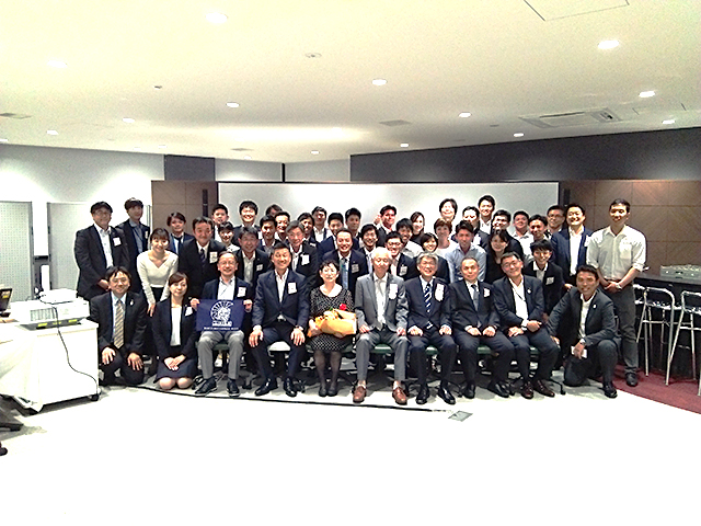 歓談のあと、今年4月に入社した4人の新社員と、今回初参加の清水学さん(平9土)が自己紹介。続いて、3月に竣工した母校千里山東体育館の作業所事務担当者・鎌谷さんから、4月に竣工し6月に開業する梅田1丁目1番地計画Ⅰ期棟(阪神百貨店)の作業所長・山本幹事から、それぞれのプロジェクトの紹介が行われた。母校の発展とともに、大阪有数のプロジェクトで活躍する卒業生の報告に感銘した。