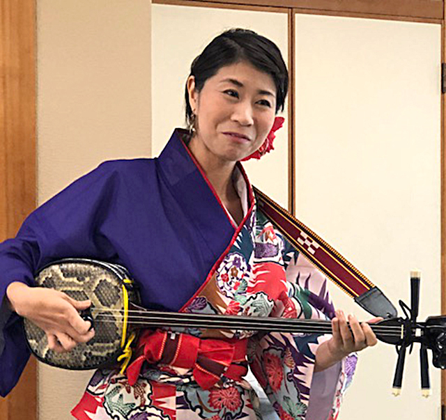 第2部懇親会では、校友会田中義昭副会長からお言葉を賜ったあと、地元紀の川の美味しい鮎料理を堪能しながら賑やかに会員相互の親睦を深めました。今回は、沖縄民謡歌手としてご活躍の藤本真希さん(平19学社)をお招きし、三線ライブを披露していただき、会場は一気に盛り上がりました。
