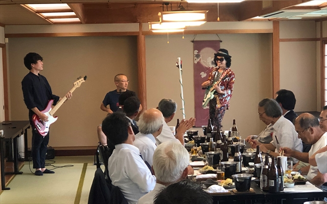 第2部の懇親会では、地元紀の川の鮎を堪能しながら賑やかに会員相互の親睦を深めました。今年のアトラクションは、橋本市役所職員で結成している「橋本市地域活性化バンド・太郎さんズ」にご当地ロックンロールを演奏いただき、会場は一気に盛り上がりました。