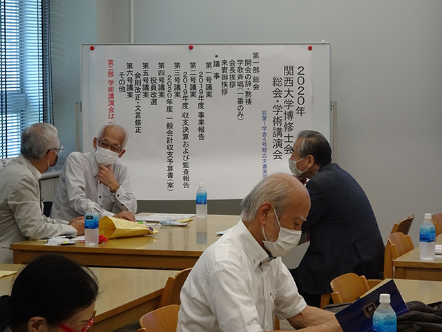 物故者に黙とうを捧げ、飛沫防止の観点から、学歌を一同で聞くことにした。その後、芝井学長を始め来賓からご挨拶を頂戴し、議事に移った。会則に沿って、北嶋会長の議長のもとで、2019年度事業報告と収支決算報告を承認。2020年度一般会計予算、会則の変更(文言等を実態に合わせる)について決議した。今年度は役員改選の年であり、北嶋会長の再選を全会一致で承認し、他の役員については選任していくことで了承した。