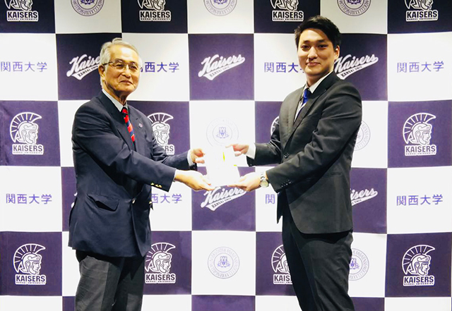 体育OBOG会現役体育会と応援団に 活動支援金を贈呈 2020年11月05日 今年のコロナ禍により、さまざまな活動制限が余儀なくされた体育会現役学生と応援団に、体育OBOG会から活動支援金として740万円の寄付を行った。11月5日に、東体育館にて贈呈式を開催。体育OBOG会の佐藤弘一会長(昭39学法・サッカー部OB)から、代表の体育会本部山田洋丈本部長(社4・航空部)に目録が贈呈された。