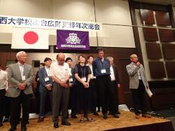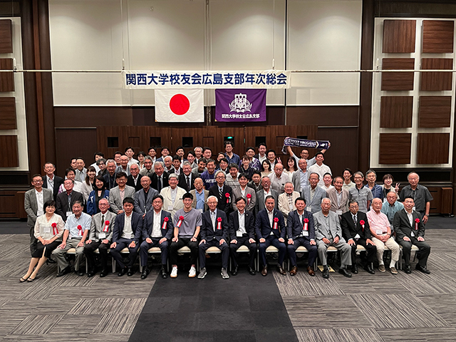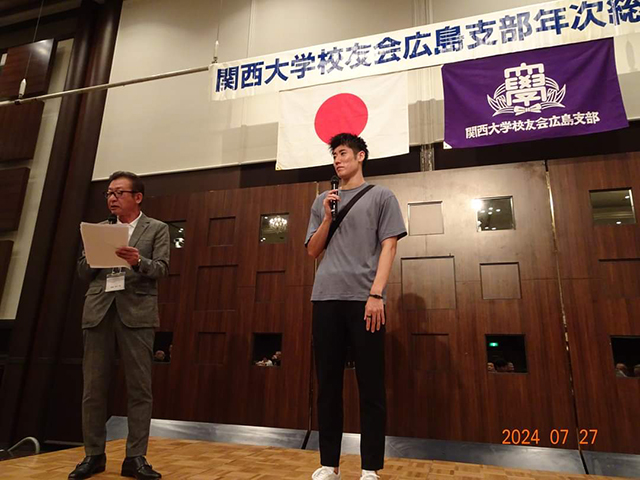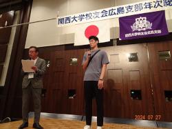 校友会本部から田中義昭副会長様、永尾俊一組織部長、事務局の村上晋様、近隣の山口千里会、備後支部、岡山支部、福岡千里会、芦屋支部、そして関西学院大学校友会広島支部からの来賓9人をお迎えし、会員64人と合わせて総勢76人のご参加をいただきました。懇親会では、特別ゲストとしてJリーグ・サンフレッチェ広島の荒木隼人選手(H31商学部卒)にご参加いただき、初参加者20人のご紹介や豪華景品の抽選会などで大いに盛り上がりました。