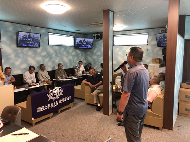 最初に学歌斉唱し、茶谷会長(昭和38・経)の開会挨拶、西出部会長(昭和51・法)の乾杯音頭で開会しました。4役員の挨拶替わりの4曲を皮切りに、前回に続き、全員各1曲DAMの採点大会を開催したところ、貝塚支部・西松多佳良顧問(昭和32・経)が最高得点賞を、また、西出部会長が最低得点賞を獲得され、全員の拍手喝采を浴びた。尚、各2~3曲歌い終わったところで、全員の挨拶・近況報告等フリートークのスピーチの時間となり、非常に興味のある話題もあり盛り上がりました。
