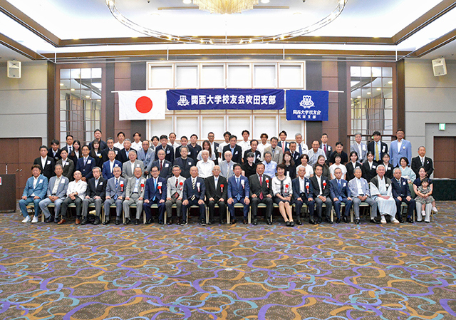 新大阪江坂東急REIホテルでの総会は、応援団のリードによる学歌斉唱、藤原輝之支部長のご挨拶、田中義信校友会長、芝井敬司理事長、後藤圭二吹田市長のご祝辞で開会。