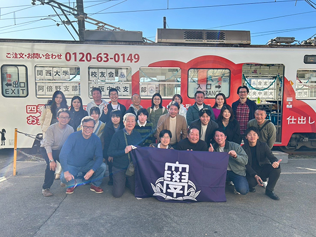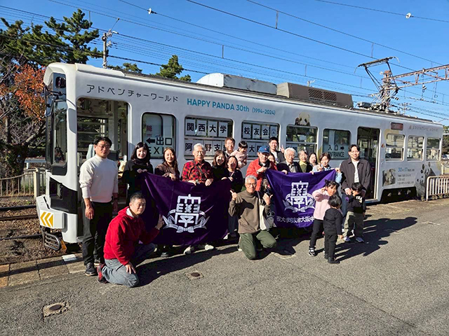 途中の停車時間には、関大サインも装飾された車両を背景に、校友会旗とともに全員で記念撮影。さらに車内では「五感」のお菓子など豪華賞品が当たるじゃんけん大会も行われ、終始笑顔と歓声に包まれながら、復路終点の天王寺駅まで楽しい時間を過ごしました。
