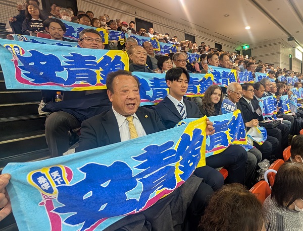 「安青錦」と書かれたタオルを持って応援する本学関係者ら