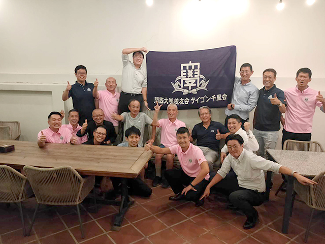 お揃いの関大ユニフォーム(ポロシャツ)で9月の関関同立ゴルフ大会の優勝をめざす。