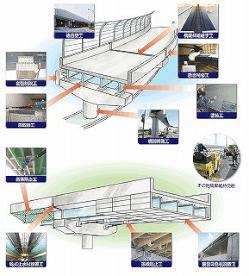 施工の実積は、阪神高速道路株式会社、NEXCO(日本高速道路株式会社)、国土交通省、大阪府・市などの官公庁が管理する道路橋などの遮音壁、橋梁伸縮継手、断面補修、橋脚補強、変位制限、沓取替、塗装、墜落防止、乾式止水材設置,落橋防止、裏面吸音設置およびその他橋梁維持全般を施工しています。